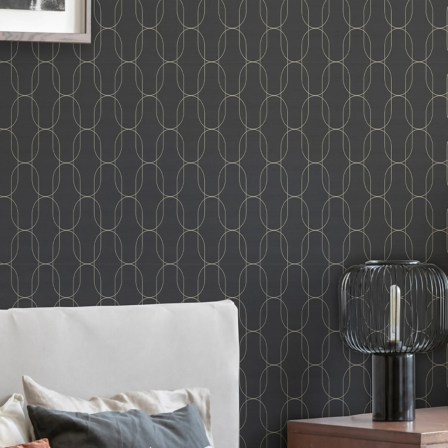 Neaten any room in your home with the Eternity wallpaper. A splendidly, elegant, and textured paper incorporates bands of gold in a squoval shape. The geo design, embossed on a sooty black background would be ideal for adding a touch of depth and charm to a feature wall.