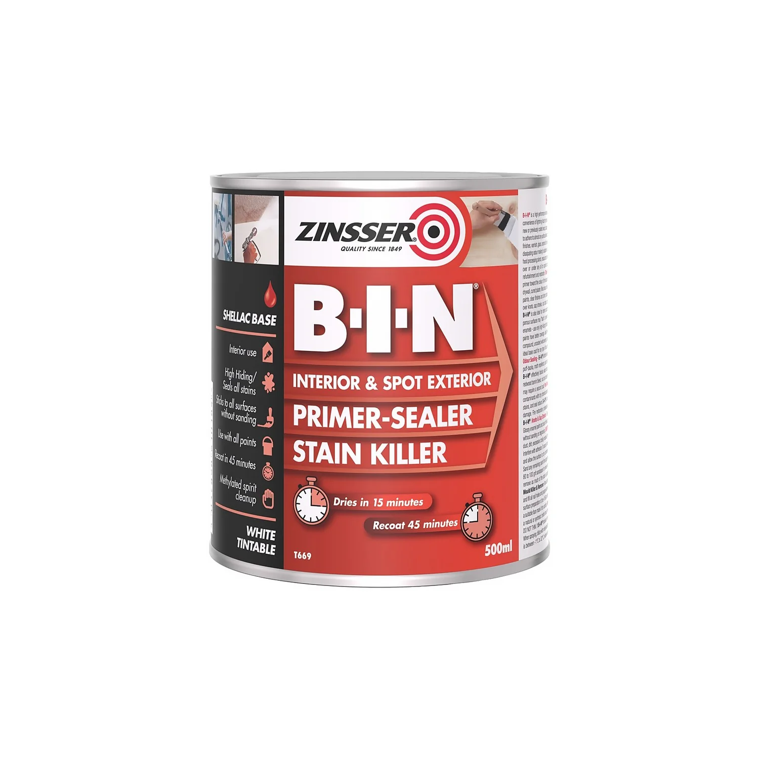 B-I-N is the ultimate shellac-based primer, sealer and stain killer. It is perfect for interior ceilings, walls, doors and related paintable surfaces and spot priming on exterior metal, trims, PVC and wood. B-I-N permanently blocks every kind of odour (from smoke and fire damage to odours from pets and nicotine). Its dried film is non-toxic and hypo-allergenic, it may be used in areas where incidental contact with food items occur. Application – Shake or stir before using. Eliminate all sources of ignition. Apply with a natural or synthetic bristle brush, roller or sprayer.